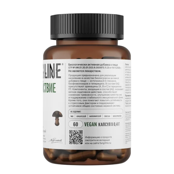 Тонкодисперсный порошок мицелия и плодовых тел ежовика гребенчатого (Hericium erinaceus) низкотемпературной сушки, тонкодисперсный порошок плодовых тел опёнка осеннего (Armillaria borealis) и рейши (Ganoderma lingzhi) низкотемпературной сушки; растительные экстракты зверобоя (Hypericum ramosissimum), шлемника байкальского (Scutellaria baicalensis) и пассифлоры (Passiflora).
