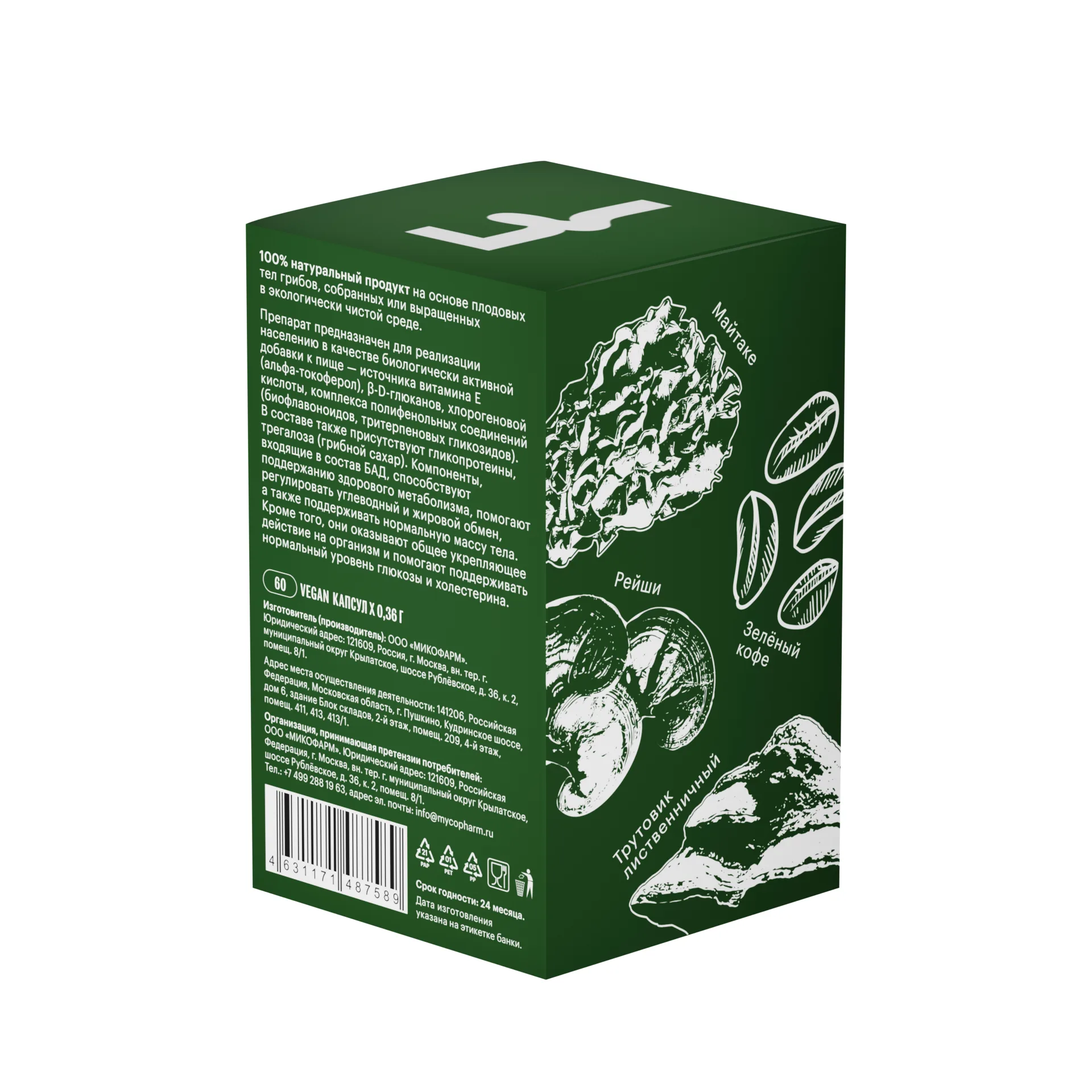 Тонкодисперсный порошок плодовых тел майтаке (Grifola frondosa), трутовика лиственничного (Laricifomes officinalis) и рейши (Ganoderma lingzhi) низкотемпературной сушки; экстракт зелёного кофе (Coffea).
